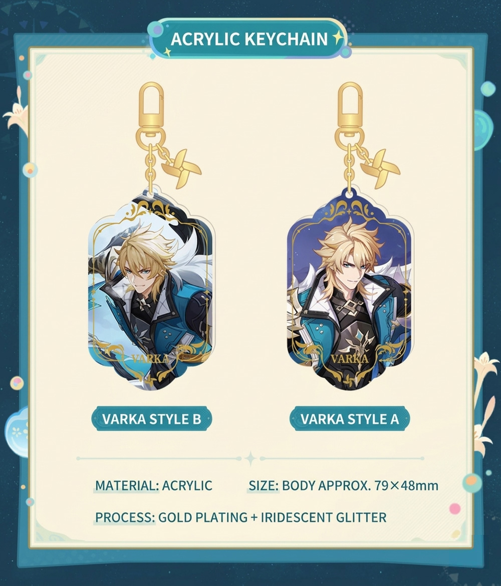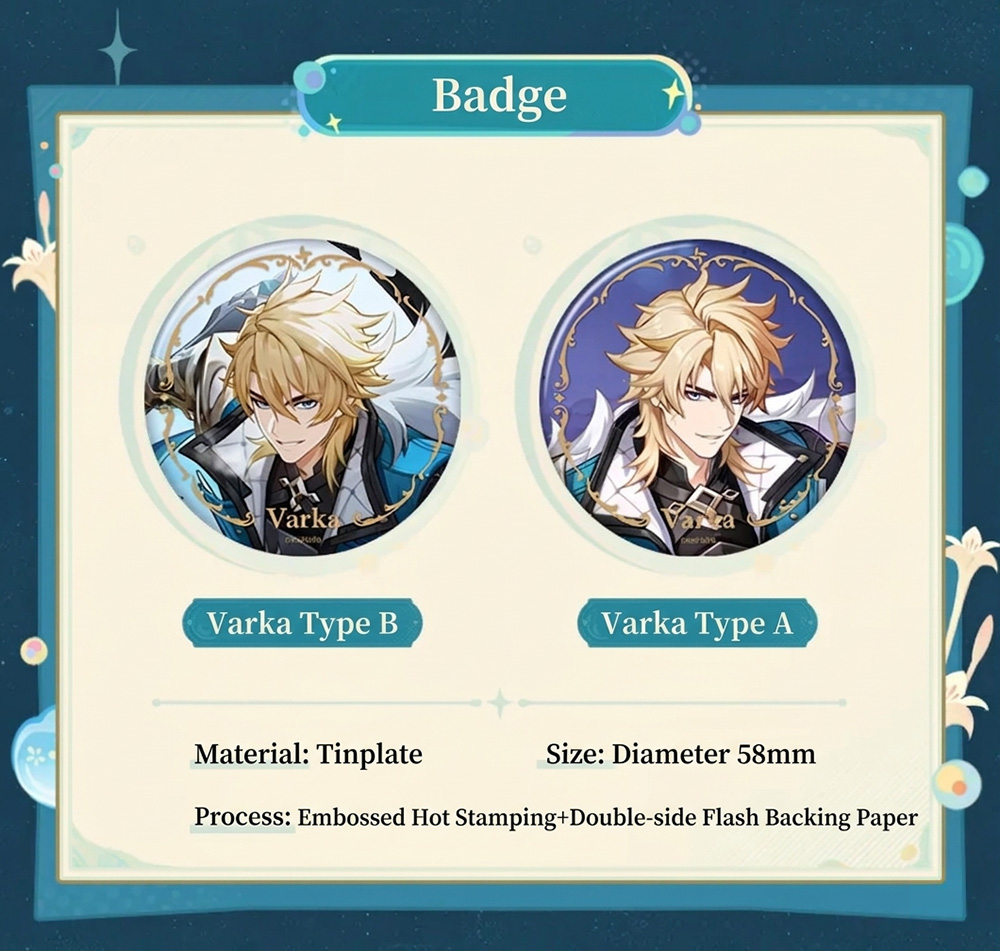 | Style | Badge – Varka Style A, Badge – Varka Style B, Acrylic Keychain – Varka Style A, Acrylic Keychain – Varka Style B, Shikishi Board, Acrylic Shikishi Board |